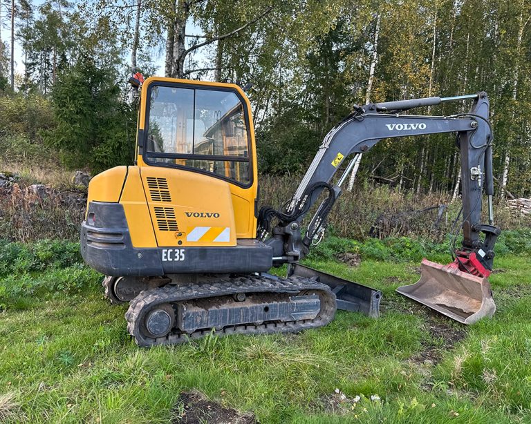 Luiska ja kuokka kauhalla, kauhanpyörittäjä, kumitelat. Paino 3500 kg, tyvitaitto. Kuljetus erikseen sovittavissa.